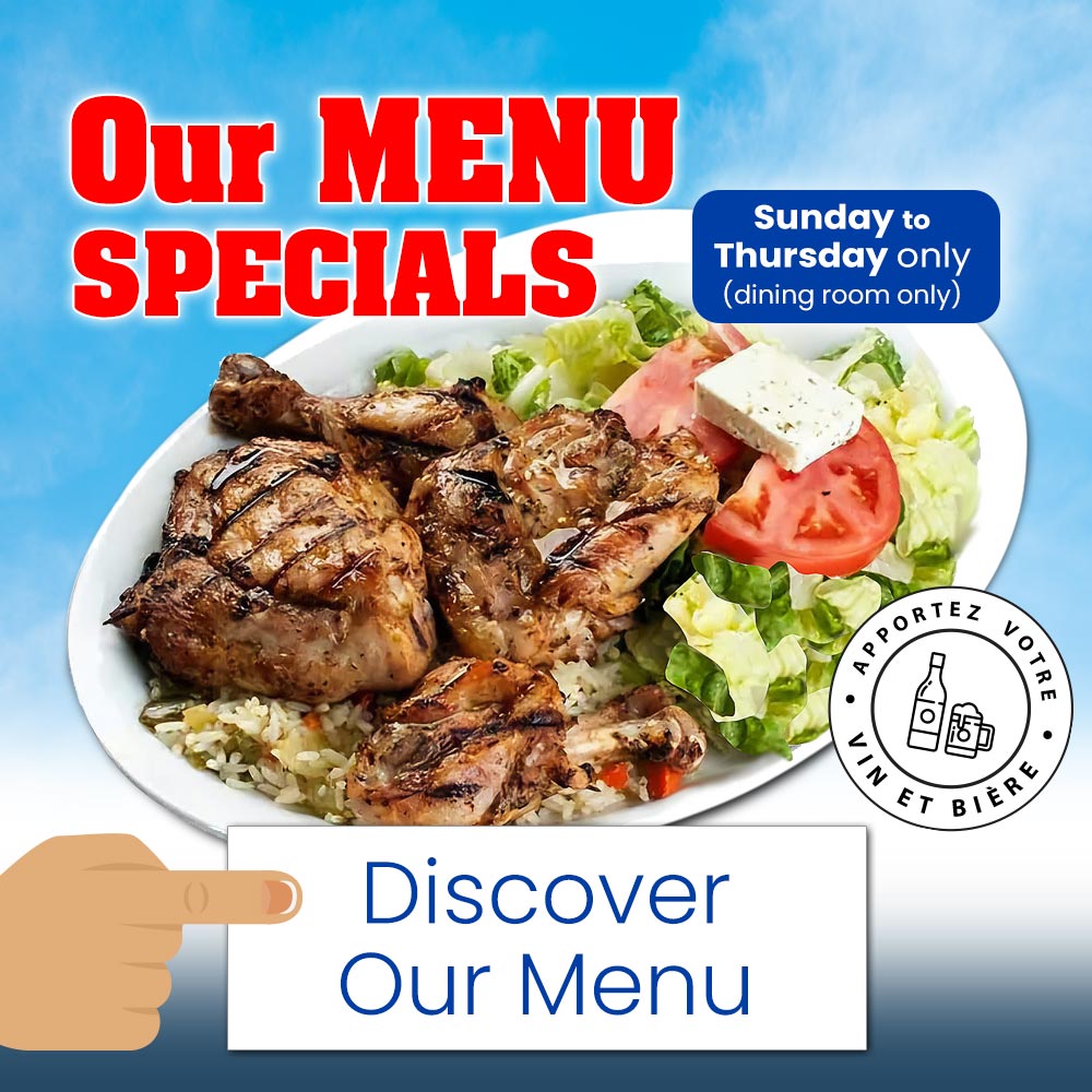If you are tired of having always the same food, we have the solution at Brochetterie Parthenon with a different menu. We offer delicious souvlakis, pita, Greek specialties, seafood, children’s menu, Greek pastries and more.